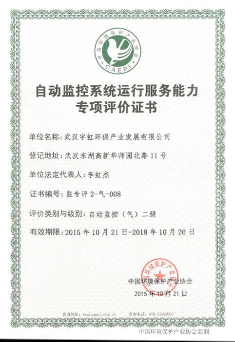 近日,武漢宇虹環(huán)保產(chǎn)業(yè)發(fā)展有限公司獲得由中國環(huán)保產(chǎn)業(yè)協(xié)會頒發(fā)的自動(dòng)監(jiān)控系統(tǒng)運(yùn)行服務(wù)能力專項(xiàng)評價(jià)證書—自動(dòng)監(jiān)控(氣)二級。